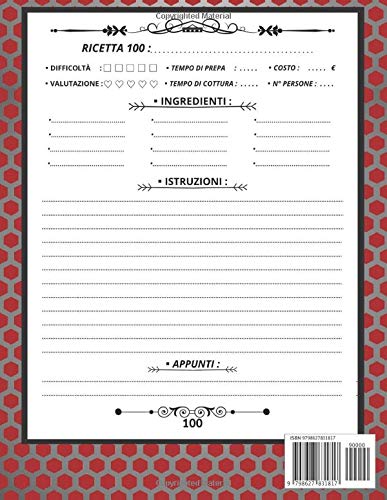 Ricettario Da Scrivere: Quaderno Ricette Da Scrivere Per 100 Ricetta Contiene Sommario