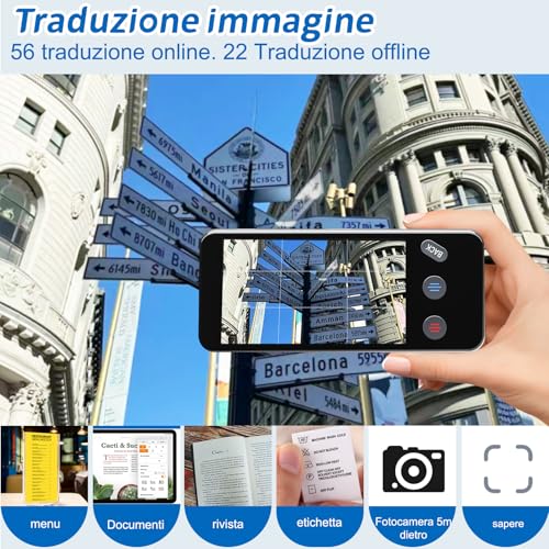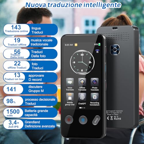 | Caratteristiche principali | • Traduzione Offline Affidabile: 19 lingue offline incluse (italiano, inglese, cinese, spagnolo, tedesco, francese, giapponese, etc.) • Supporto per 148 Lingue Online: Gestisce diversi accenti con risposte rapide, include dialetti italiani e termini tecnici. • Design Compatto e Portatile: Spessore 1,07 cm, peso 100 grammi, batteria da 1500 mAh (10 ore di autonomia). |